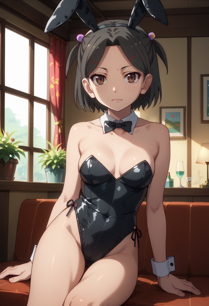 キャラクター:小木曽汐莉、髪飾り、茶色い目、黒髪、ショートヘア、髪の毛の結び目、両サイドを上げたスタイル