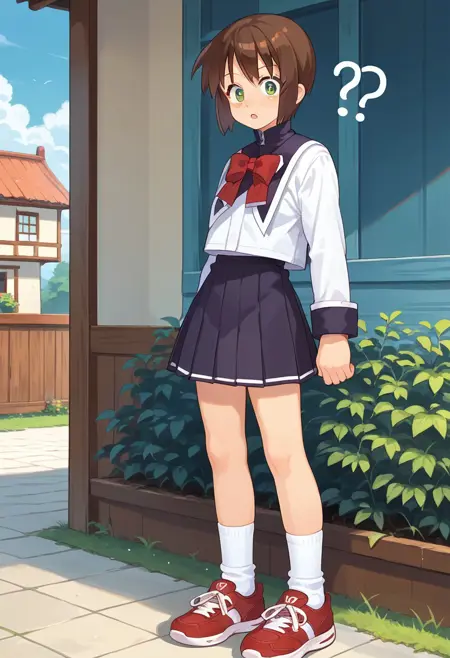 지구 의상: 학교 유니폼, 해적 칼라, 목에 매듭, 소매 단, 주름치마, 발목 양말, 흰 양말, 스니커즈, 빨간 신발