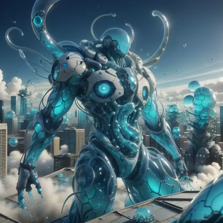 translucent, tendrils, melting," 以获得更佳生成效果。健康的 LoRA 权重范围为 0.8 至 1。