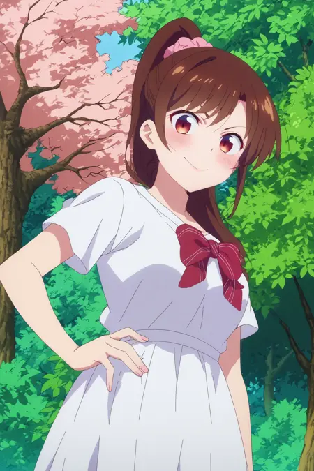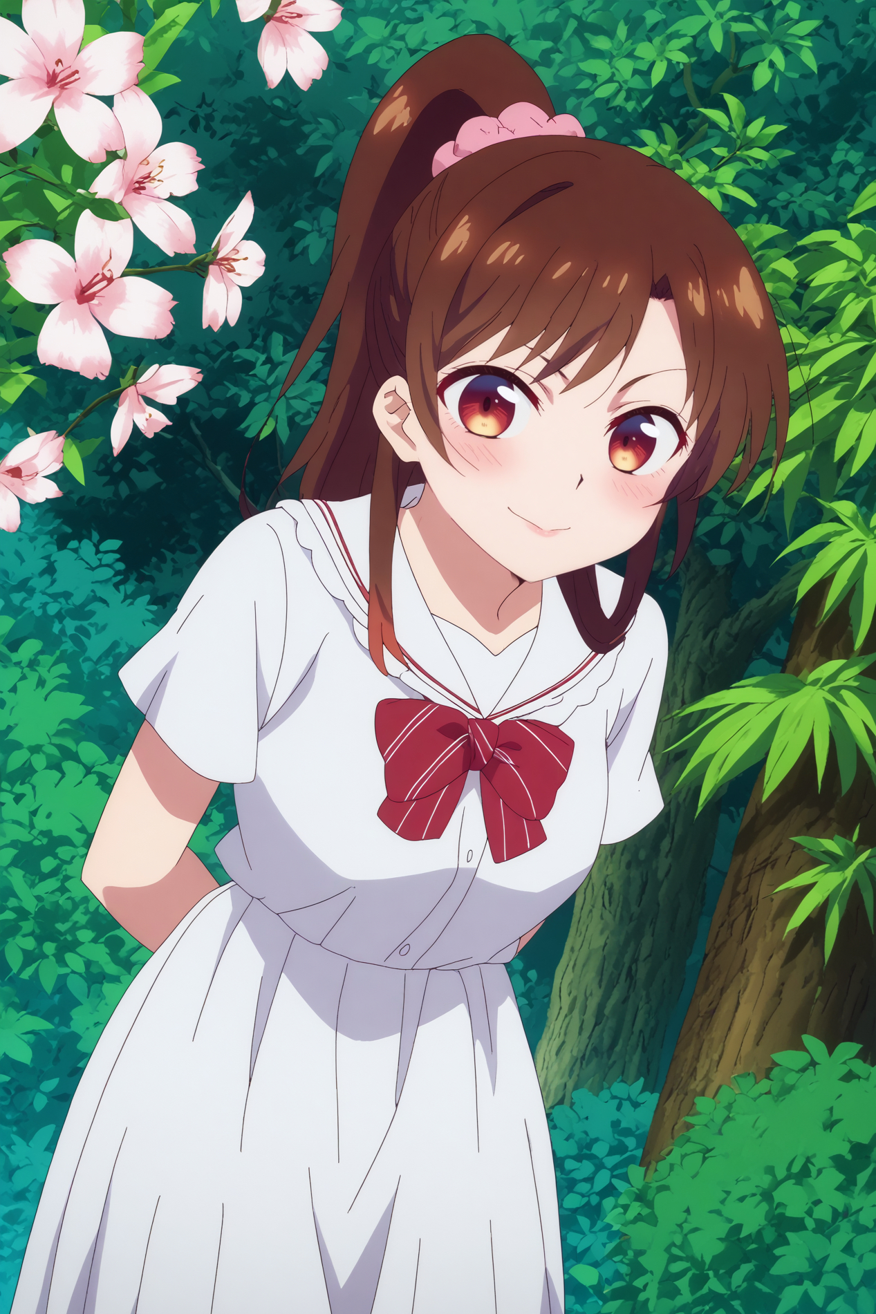 🌸 - 触发词:chizuru ichinose,1girl,solo,long hair,blush,looking at viewer,bangs,white shirt,ponytail,hair scrunchie,scrunchie,braid,white skirt,smile