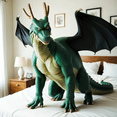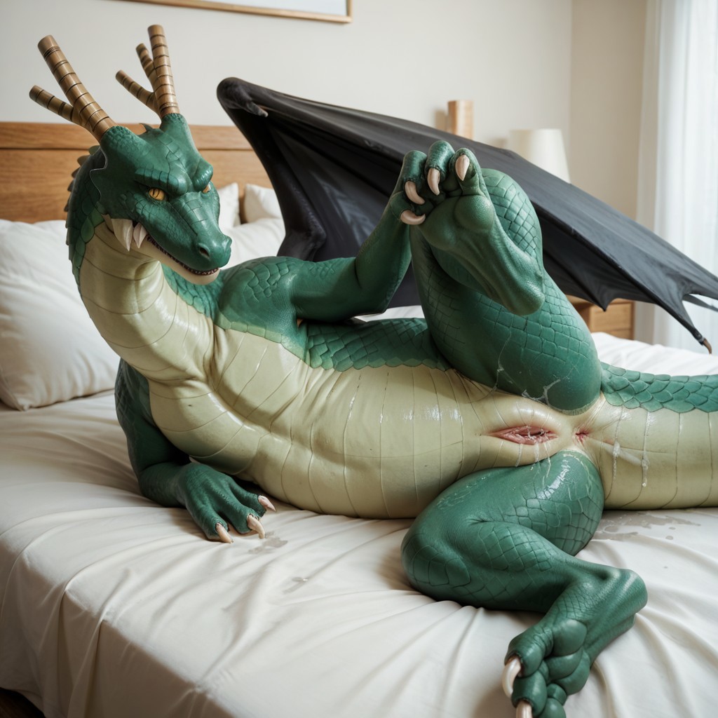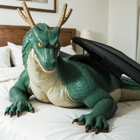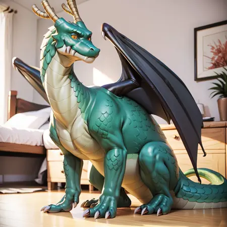 Additional prompts: dragon, green scales, black wings, horns, tail, claws, female, 1girl, yellow eyes, slit pupils