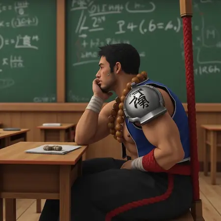 オプション:ゲームモデル、腕巻き、広めの黒いズボン、赤いロープベルト、大きな木製ビーズのネックレス、黒いブーツ、戦闘 staff を持っている、木製の戦闘 staff、眉 piercing、肩ガード、雷の漢字、青いオープンなハーフベスト、イヤリング