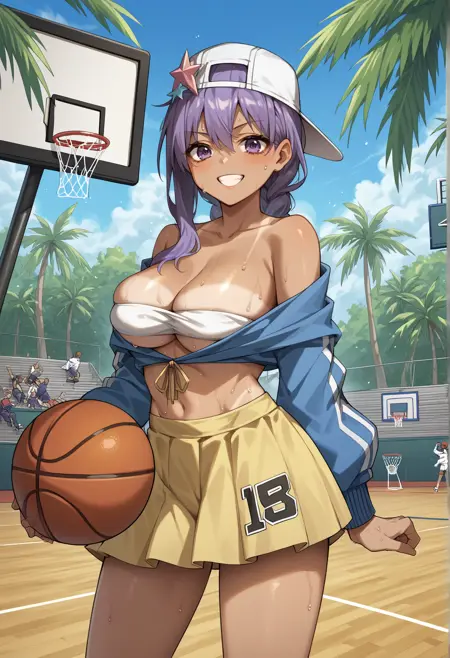 水着1:異常に長い髪、紫髪、紫目、片側の前髪、一本の編み込み、逆さの帽子、短めのジャケット、黄色いトラックスーツ、黄色いスカート、星(シンボル)、チューブトップ