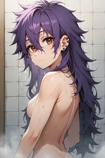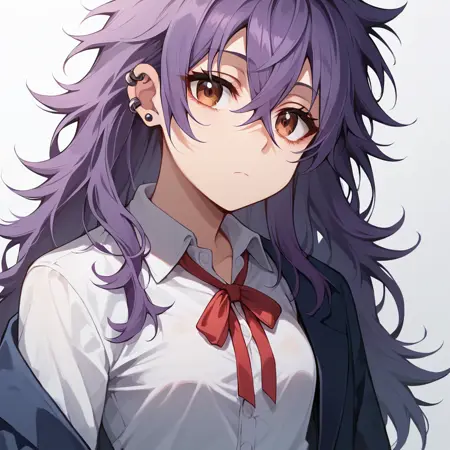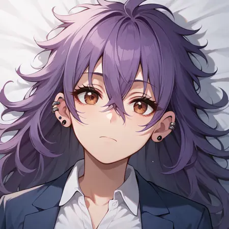 紫の髪、乱れた髪、無表情、イヤリング、ピアス