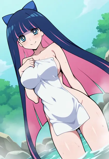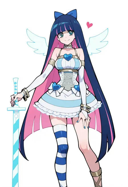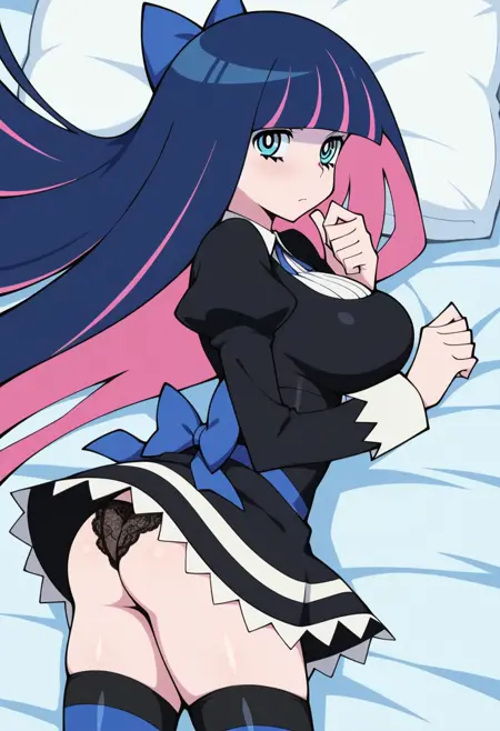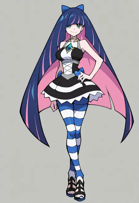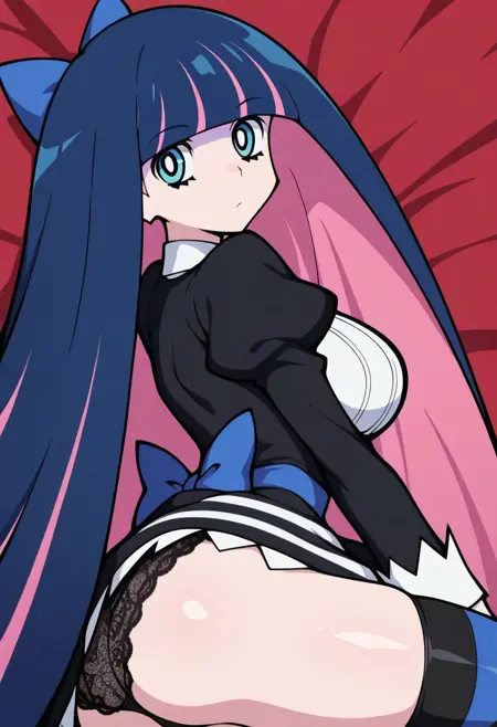 パットストッキング、ストッキングの無政府状態、青い目、青い髪、色付きの内側の髪、髪のリボン、長い髪、多色の髪、ピンクの髪、ツートーンの髪、前髪、まっすぐな前髪、縞模様の太ももまであるストッキング、黒いドレス、ふくらはぎの袖、長い袖、衿付きシャツ、白いシャツ