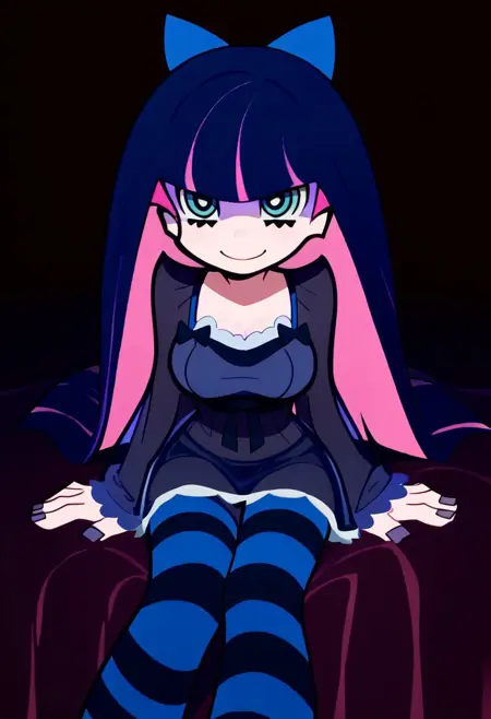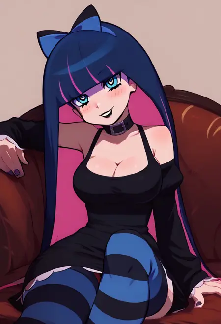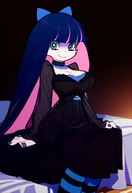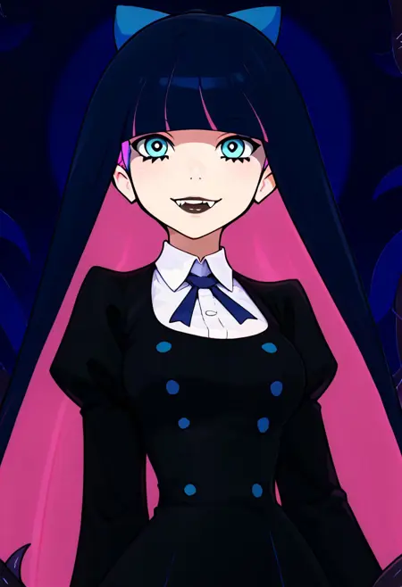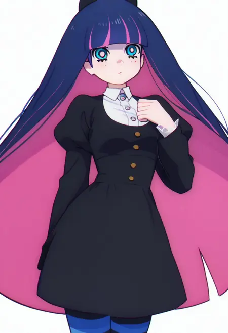 patStocking, stocking anarchy, blue eyes, blue hair, colored inner hair, hair bow, long hair, multicolored hair, pink hair, two-tone hair, bangs, blunt bangs, striped thighhighs, black dress, puffy sleeves, long sleeves, collared shirt, white shirt,