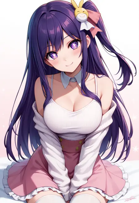 patHoshino、ai hoshino、hoshino ai、長い髪、前髪、紫色の目、紫色の髪、シンボル形状の瞳、長い袖、セーター、リブ編みセーター、白いカマソール、片方上げ、髪飾り、髪リボン、白いシンデレラ丈靴下、絶対領域、アイドル、ピンクのドレス、ノースリーブ、ピンクのスカート、フリルスカート、肩出し、白いカラー、