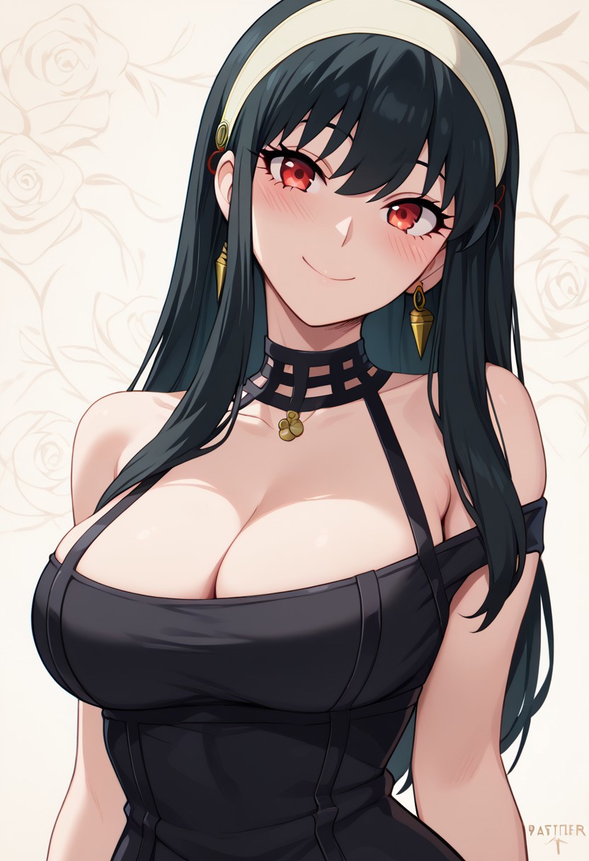 patYor, yor briar, black hair, red eyes, earrings, white hairband, hairband, long hair, sidelocks, dress, cleavage, bare shoulders, jewelry, collarbone, sleeveless, black dress, halterneck, white headband,