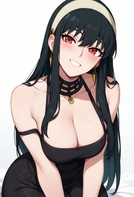 patYor,你的石楠,黑发,红眼,耳环,白色发带,发带,长发,侧发,连衣裙,露胸,裸肩,珠宝,锁骨,无袖,黑色连衣裙,吊带,白色头带,