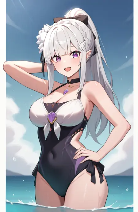 泳装:LMFit,连体泳衣,胸部露点,项圈,锁骨,马尾,发带,发型变体,休闲连体泳衣,裸肩,紫色丝带,发花,白花,遮肚脐,宝石