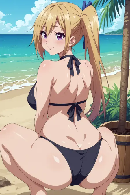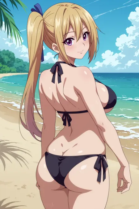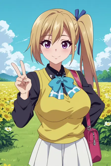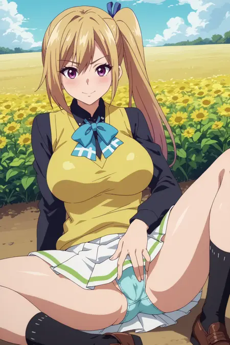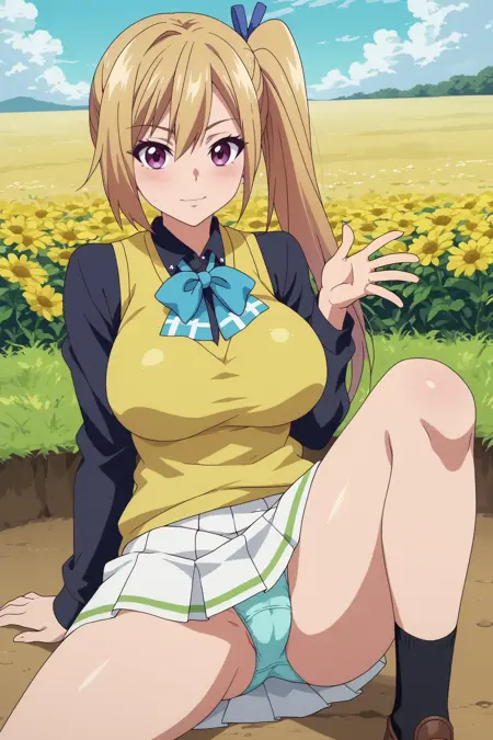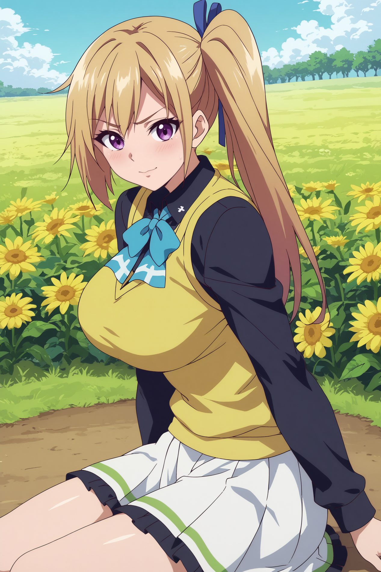 트리거: Mai Kawakami, 1girl, solo, smile, mole, mole under eye, long hair, side ponytail, purple eyes, ribbon, hair ribbon, sweater vest, looking at viewer, school uniform, large breasts, white skirt