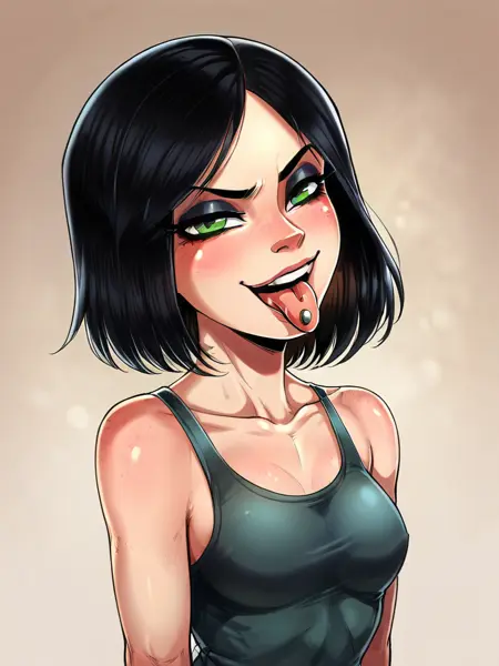 Meat: vault meat, black hair, medium hair, green eyes, eyeshadow, large breasts,