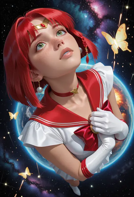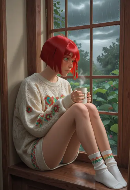 red hair, short hair, bob cut, braid, freckles, green eyes,