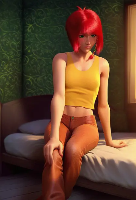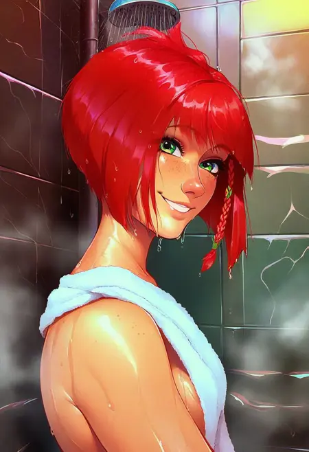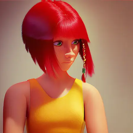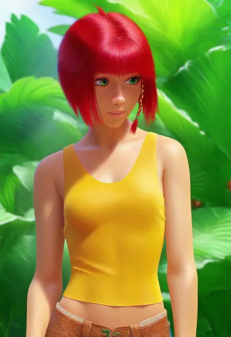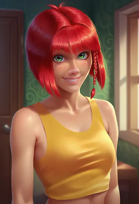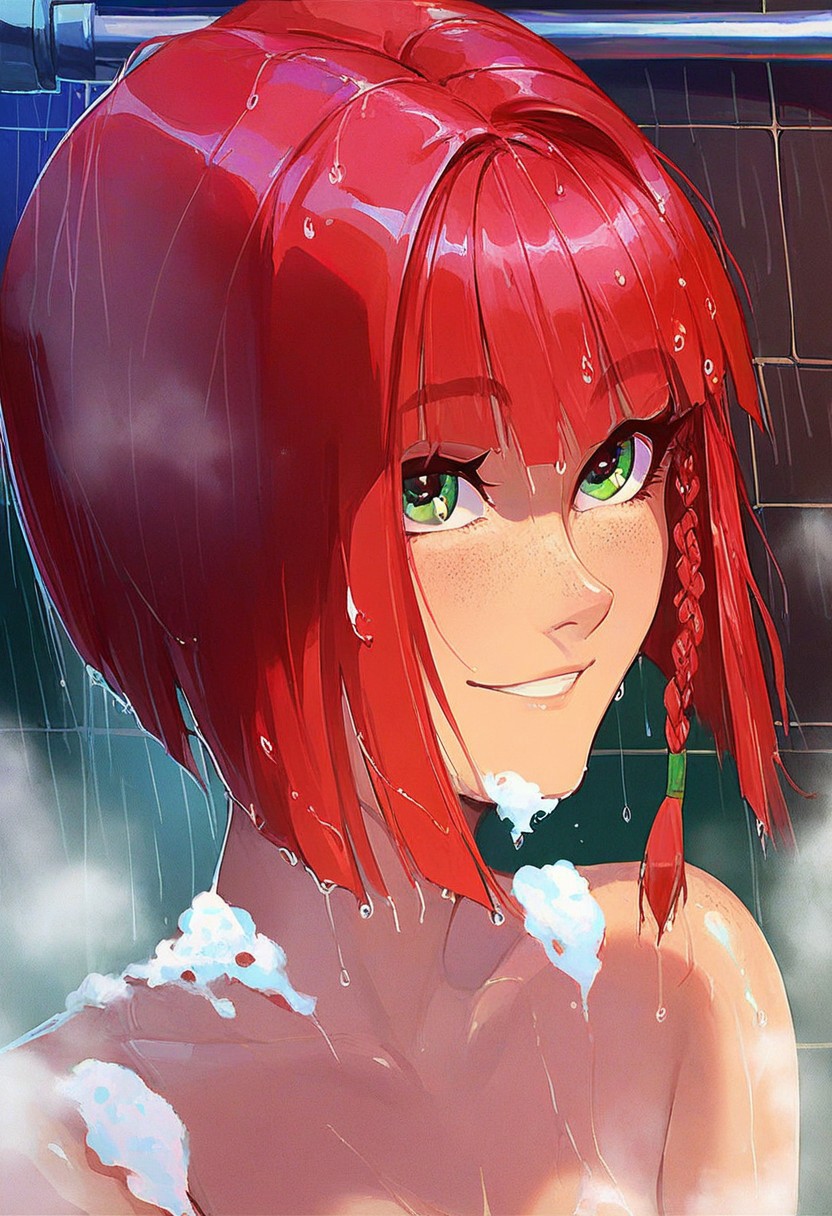 m4sh4, red hair, short hair, bob cut, braid, freckles, green eyes,