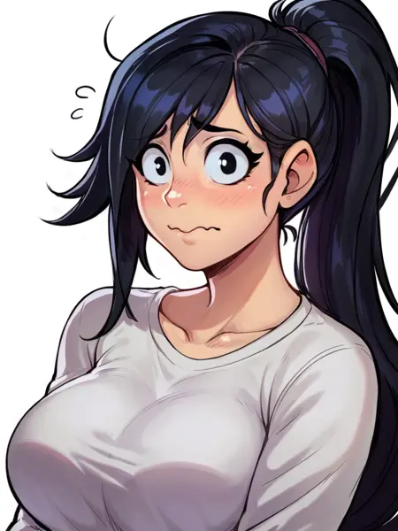 stacey shad, black hair, ponytail, asymmetrical bangs, black eyes, large breasts,