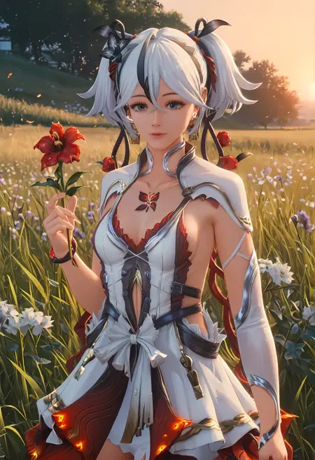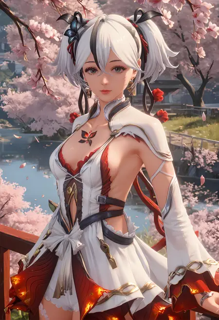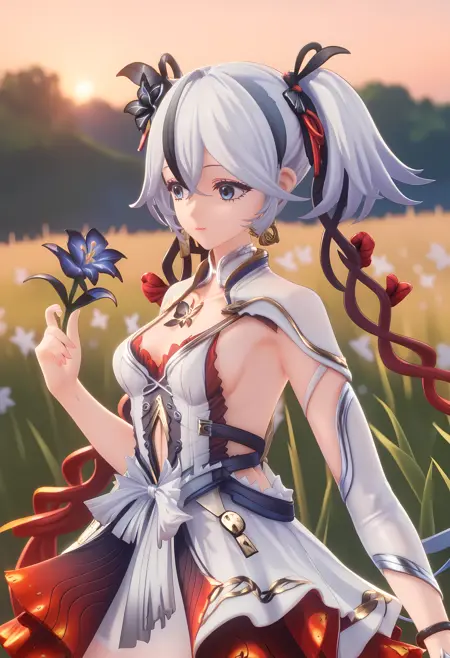 Appearance → ohwx, 1girl, solo, breasts, multicolored_hair, jewelry, hair_between_eyes, twintails, white_hair, streaked_hair, earrings, hair_ornament, black_hair, flower, short_hair, blue_eyes, ribbon, hair_ribbon, blue_hair, medium_breasts,