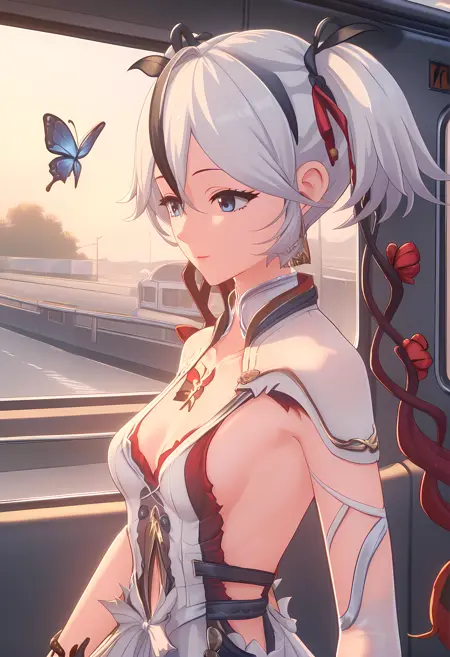 Outfit → dress, white_dress, clothing_cutout, pantyhose, white_pantyhose, detached_sleeves, cleavage, bug, butterfly, sideboob,