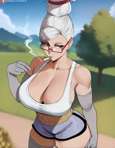 "ayasegy, ハラマキ, 大きな胸, グレーのハイソックス, 胸元, 短めのショートパンツ, 白髪, アップドゥ, 赤枠メガネ, 白いタンクトップ, ドルフィンショーツ, 青いショートパンツ, グレーのエルボーグローブ, 茶色の目"