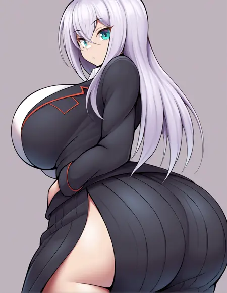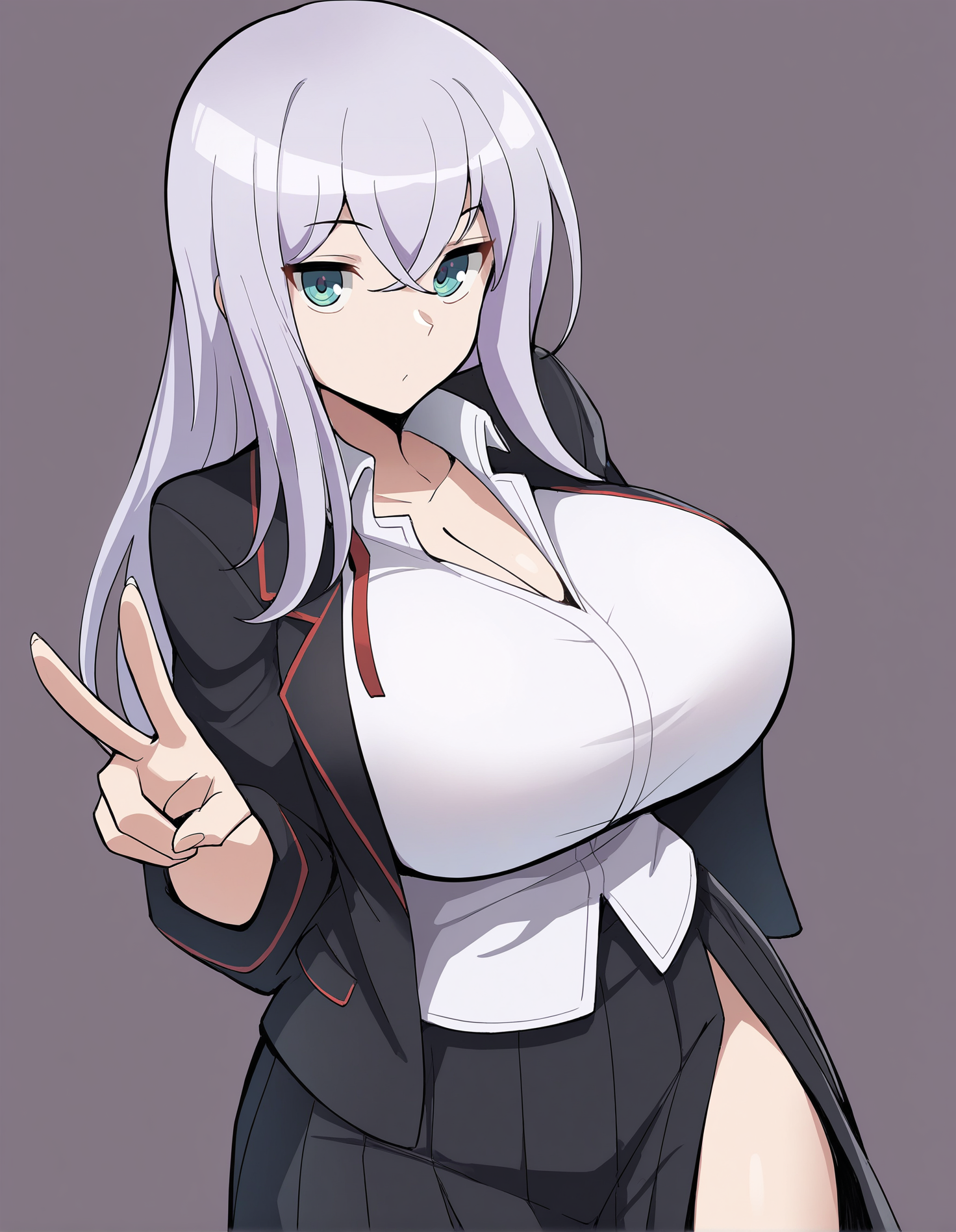 "misakitokuraba, 長い髪, サイドスリット, ブレザー, 銀髪, 白シャツ, プリーツスカート, 長いスカート, 水色の目"