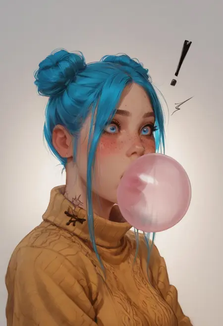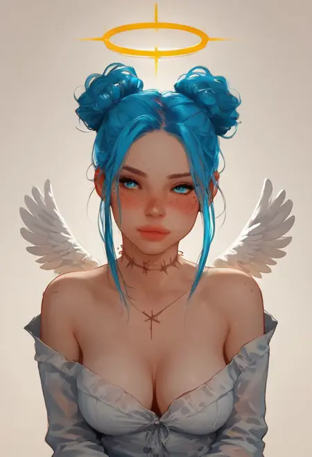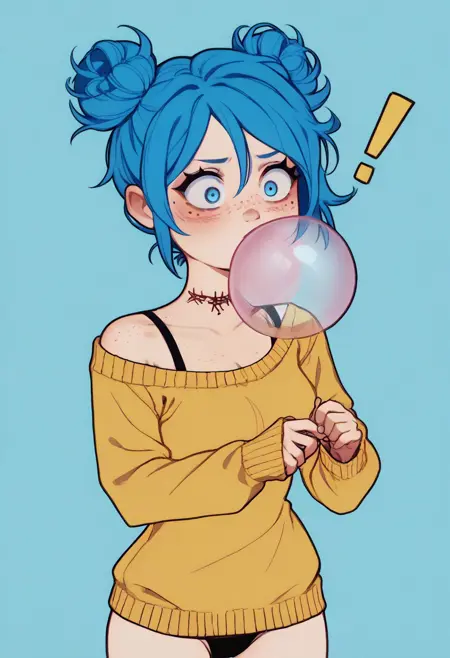 1girl, Eggie, 青い髪, 髪の二つの結び目, 青い目, そばかす, ほっぺたの紅潮, 鉄条網の首のタトゥー