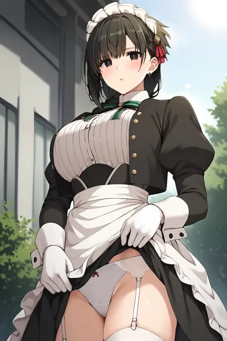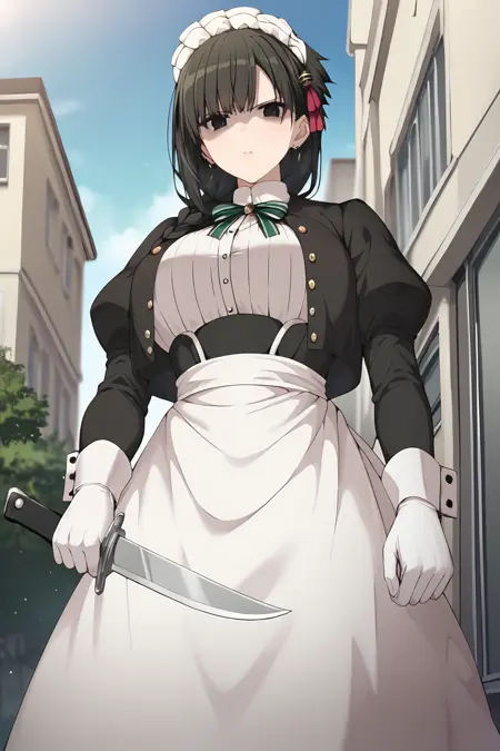 | トレーニングワード | yuki_wz, black hair, long hair, single braid, braided ponytail, earrings, hair ornament, red ribborn, hair ribbon, hair bell, maid headdress, black eyes, bright pupils, white pupils, large breasts, white gloves, white apron, maid apron, long sleeves, juliet sleeves, green bowtie, buttons, black jacket, black dress, cropped jacket, maidコピーしました! |