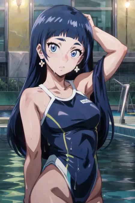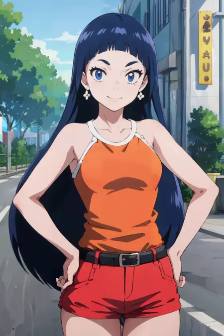 hana wz, blue hair, very long hair, hime cut, flower earrings, earrings, jewerly, blue eyes, eyelashes, medium breasts, red shorts, black belt, tank top, blunt bangs, orange shirt, bare shoulders, sleeveless shirt