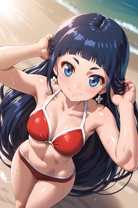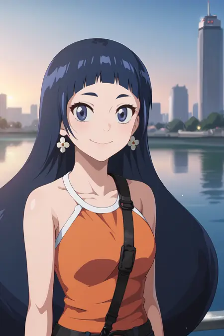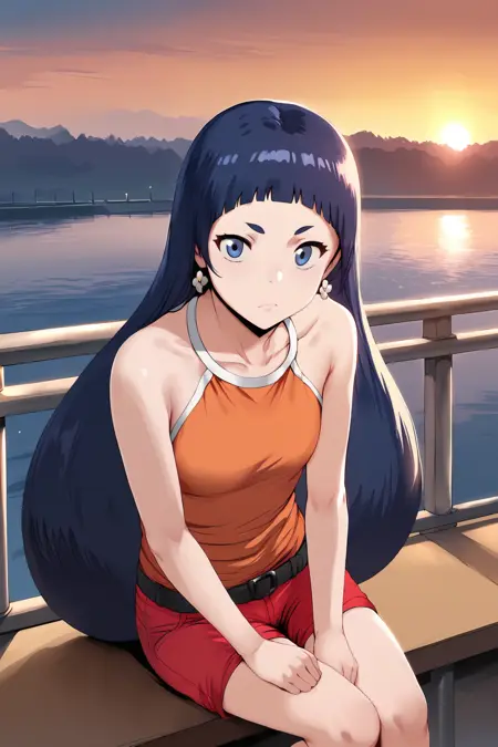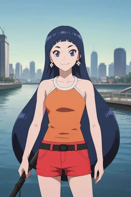 hana wz, blue hair, very long hair, hime cut, flower earrings, earrings, jewerly, blue eyes, eyelashes, red shorts, black belt, tank top, blunt bangs, orange shirt, bare shoulders, sleeveless shirt