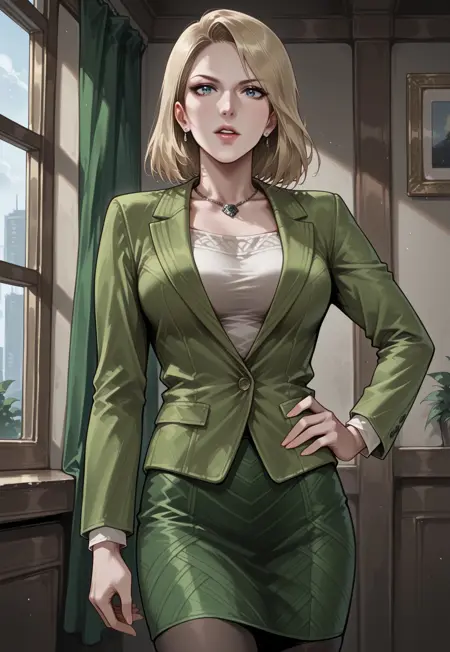 • 녹색 정장 자켓, 셔츠, 녹색 치마, 팬티스타킹, 목걸이, 귀걸이, 하이힐,
