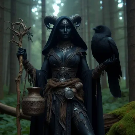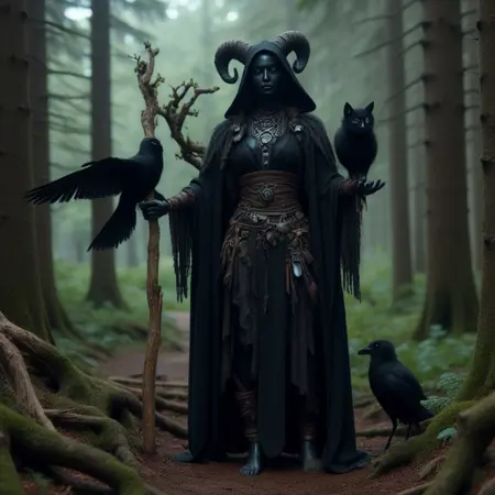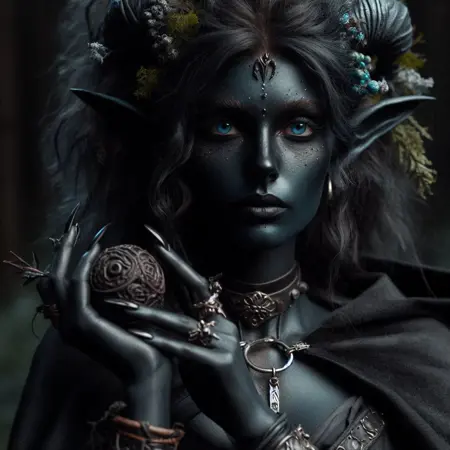 in the heart of the Whispering Woods, a forest shrouded in mystery and ancient magic. Her onyx-black skin allows her to blend seamlessly into the forest shadows, an ability that has served her well in her lifelong mission to protect the wilderness. Raised by the Elder Druids of the Shadow Grove, Vespera was taught the ancient ways of the druidic arts, learning to harness the natural world and communicate with its nocturnal inhabitants.