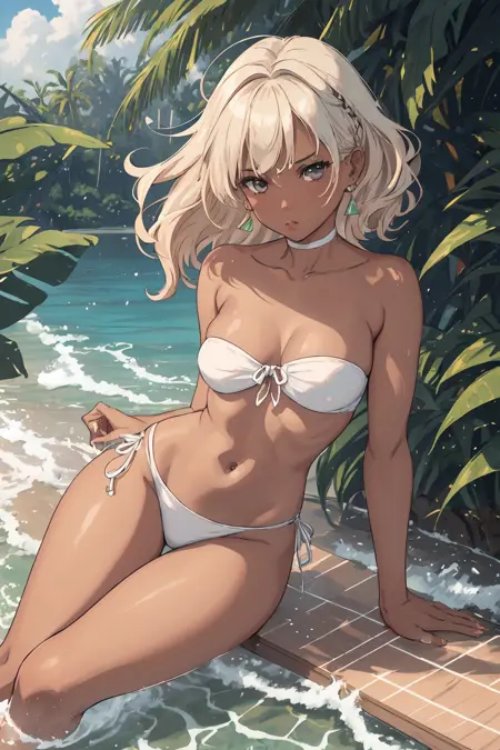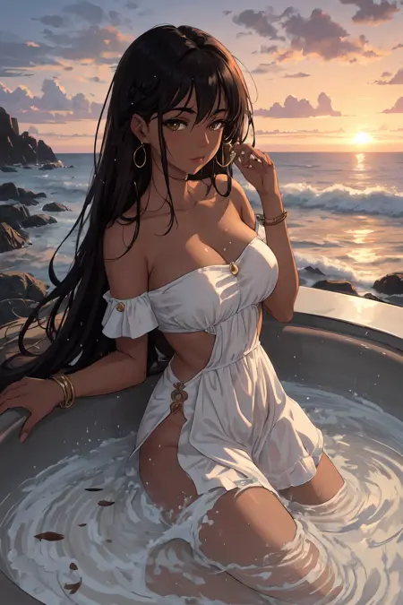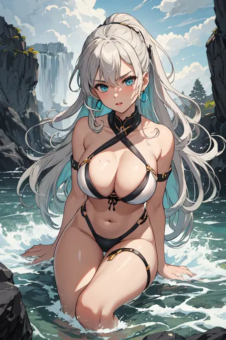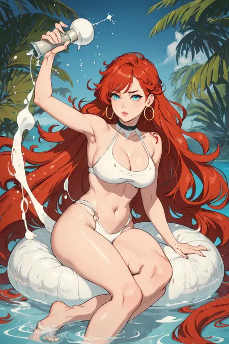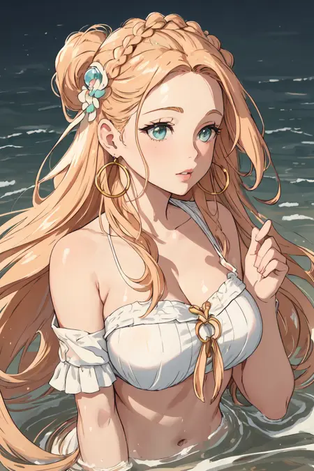 Refreshing coconut water, Smooth and creamy, Creating waves, Lady, Tall, Thin, Round Face, Olive Skin, Honey Blonde Hair, teal Eyes, Wide Nose, Pouty Lips, Receding Chin, Long Hair, Wavy Hair, Beach Waves, asymmetrical breasts, , magenta metallic lipstick, Sprinkled with shimmering liquid, Sparkling sunlight on wavessubmerged_preppy_bae μμ ν둬ννΈ: