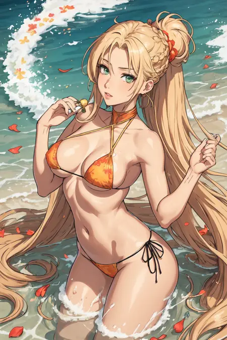 Racing against the clock on a liquid track, one-piece swimsuit, Lady, Tall, Thin, Round Face, Olive Skin, Honey Blonde Hair, teal Eyes, Wide Nose, Pouty Lips, Receding Chin, Long Hair, Wavy Hair, Beach Waves, asymmetrical breasts, , magenta metallic lipstick, Sparkling sunlight on wavesfemale_bikini_sugbmerged_in_liquid μμ ν둬ννΈ: