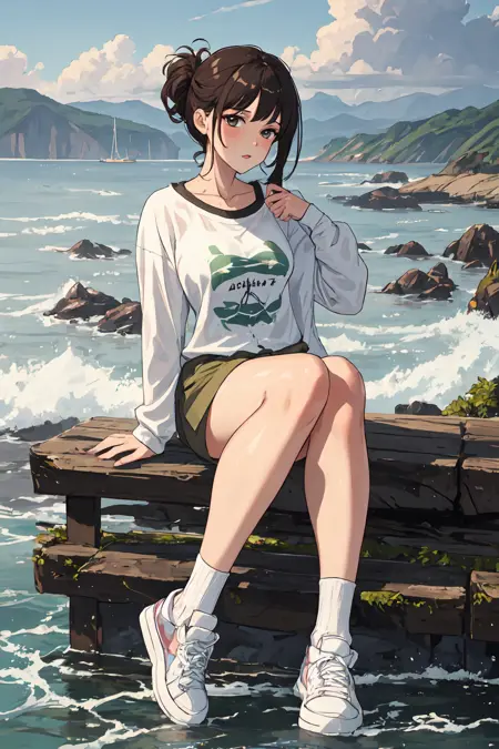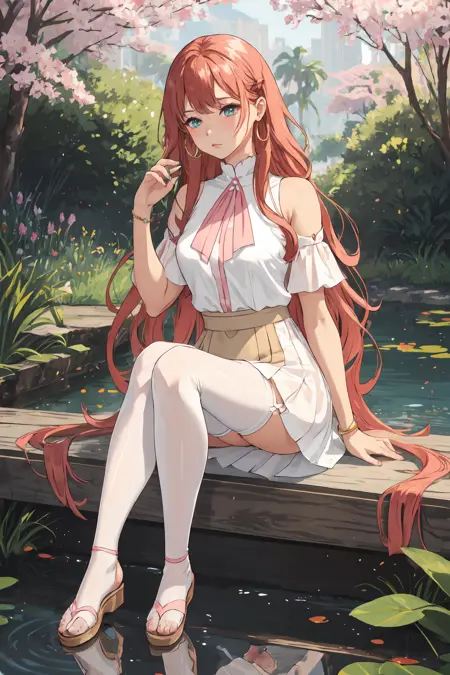 Gingham shirt dress, wide leather belt, white tights, and black ballet flats, Lady, Tall, Thin, Round Face, Olive Skin, Honey Blonde Hair, teal Eyes, Wide Nose, Pouty Lips, Receding Chin, Long Hair, Wavy Hair, Beach Waves, asymmetrical breasts, , magenta metallic lipstick, Refreshing coconut water, Sprinkled with shimmering liquid, Sparkling sunlight on waveswater_yoga μμ ν둬ννΈ: