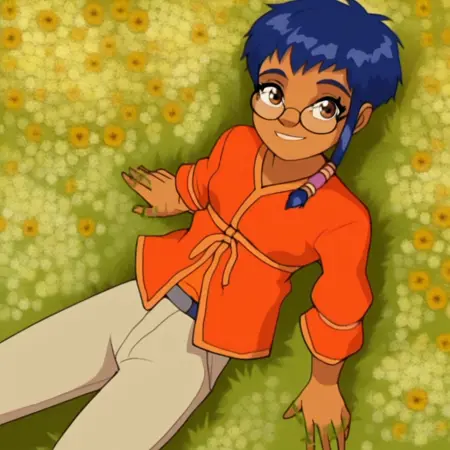taranee_c, 1girl, blue hair, short hair, sidelocks, dark skin, glasses, brown eyes, orange shirt, pants