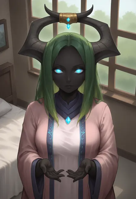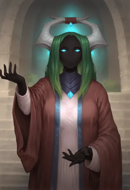 1girl, 색소가 있는 피부, 검은 피부, 녹색 머리카락, 얼굴 없음, 뿔, 파란 눈, 긴 머리카락, 빛나는, 빛나는 눈, 보석, 가슴, 넓은 소매, 로브