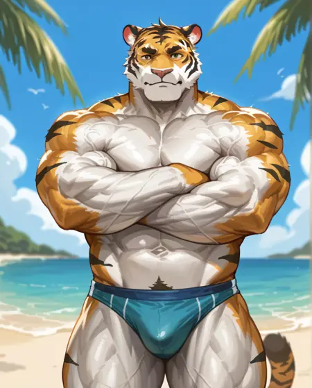 masterpiece, best quality, amazing quality, very aesthetic, high resolution, ultra-detailed, absurdres, newest, scenery, depth of field, scenery, volumetric lighting, by traveler, avian, 1boy, solo, male focus, nipples, bulge, male underwear, underwear, furry male, furry, arm hair, athletic, athletic male, topless male, bed, beroom, underwear only, large pectorals, on side, lying on side, looking at viewer