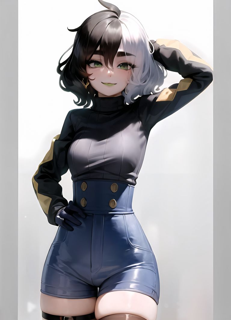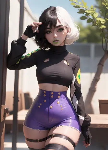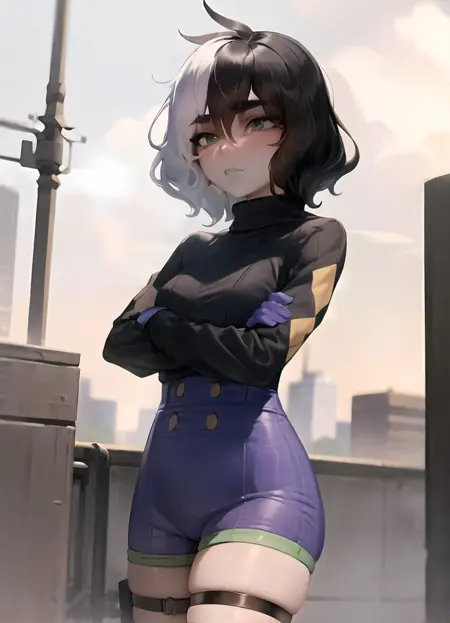 (thigh strap, single thighhigh,purple high waist shorts, black sweater , long sleeves, single glove:1.2)