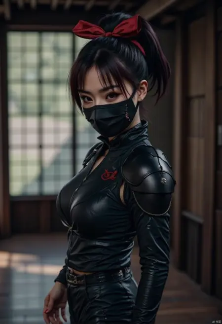 - 推荐:刺客服装,一位女性身着黑色皮衣,佩戴黑色面罩,头发上系着红色蝴蝶结。她的秀发是利落的齐耳短发,为画面增添一抹亮色。她站在木质建筑前,大型窗户让自然光线洒在她的脸上。