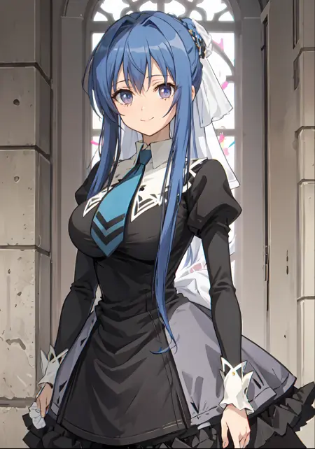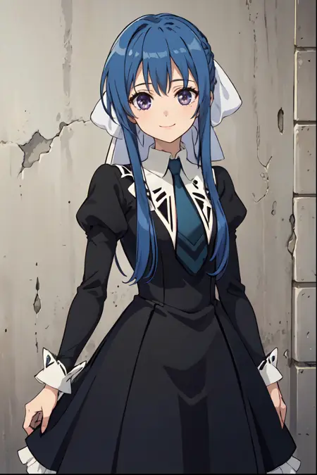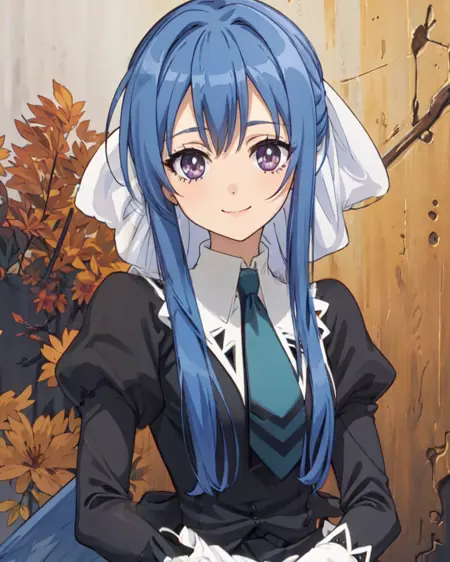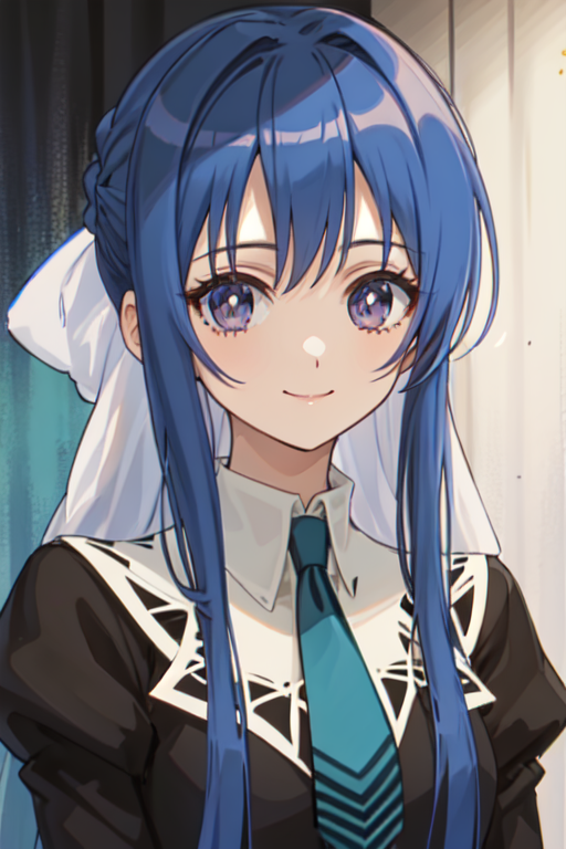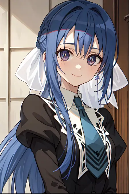 주요 프롬프트는: 타마오, 1girl, solo, 파란 머리, 긴 머리, 리본, 사이드락, 넥타이, 시청자 바라보기, 보라색 눈, 긴 소매, 학교, 검은 유니폼, 퍼프입니다.