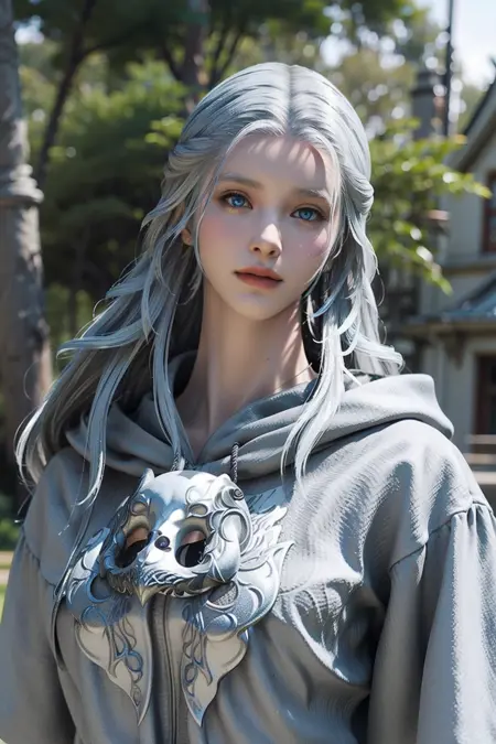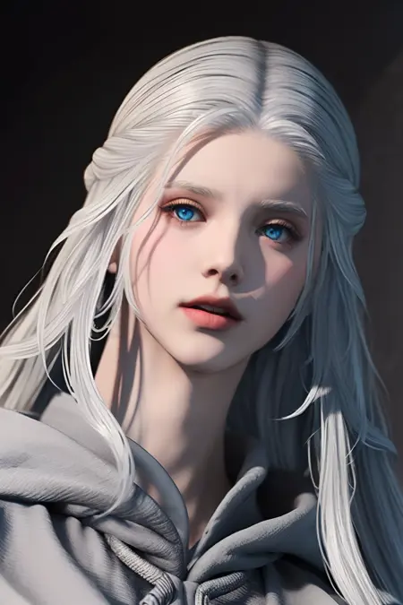 태그: blue_eyes, white_hair, white_robe, long_sleeves