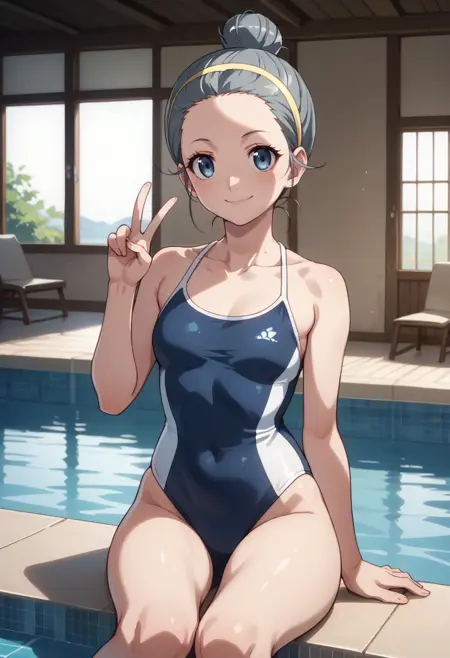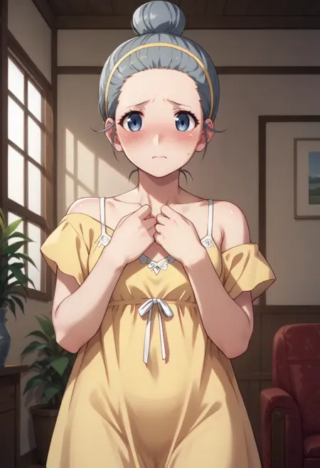 衣装:黄色のヘアバンド、青いショートパンツ、白いシャツ、肩出し、お腹が出ている