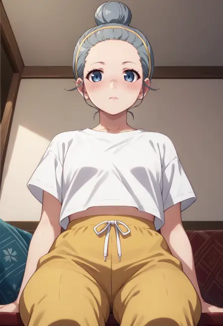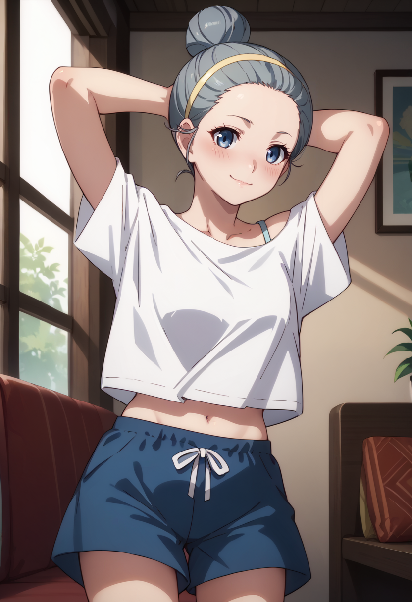 服装:黄色发带,蓝色短裤,白色上衣,露肩,露脐
