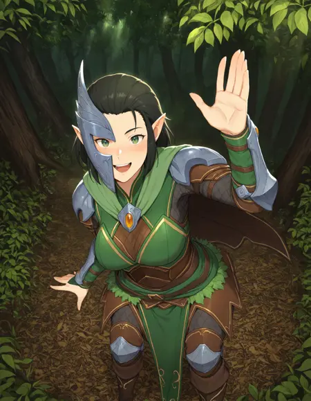 Naestra, silver mask, pointy ears, black hair, green eyes, armor,
