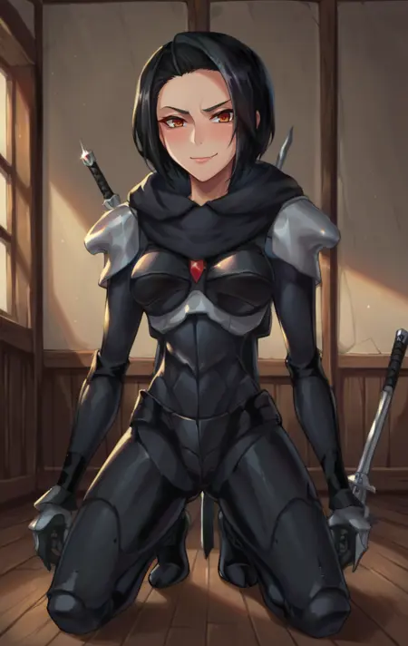 karaiSDXL,1girl,solo,short hair,black hair,brown eyes,weapon,armor,bodysuit