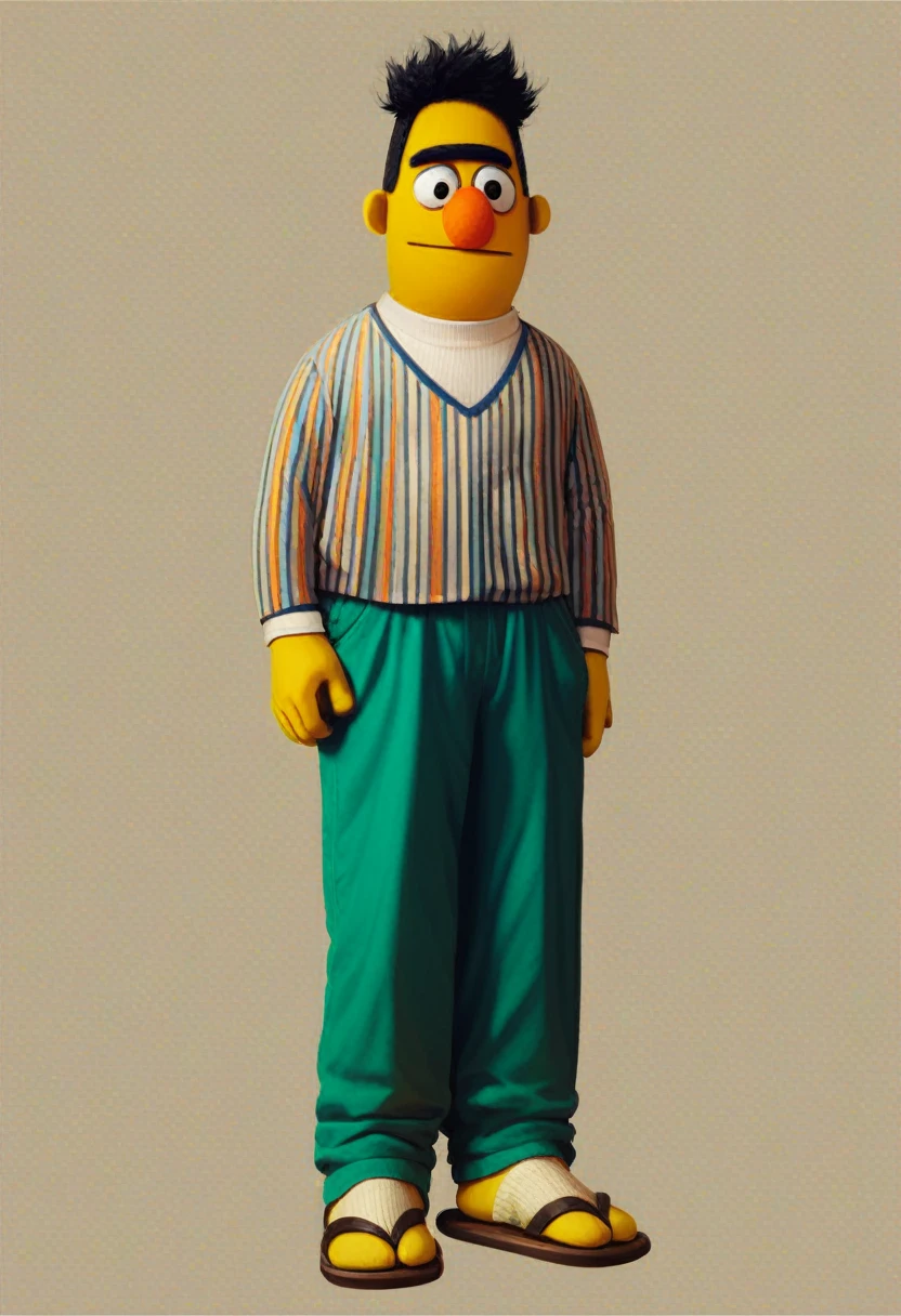 Bert_Sesame, 1boy, shirt, black hair, long sleeves, white shirt, sandals, pants, striped clothes, black eyes, striped shirt, yellow skin, dark green pants, beige socks,