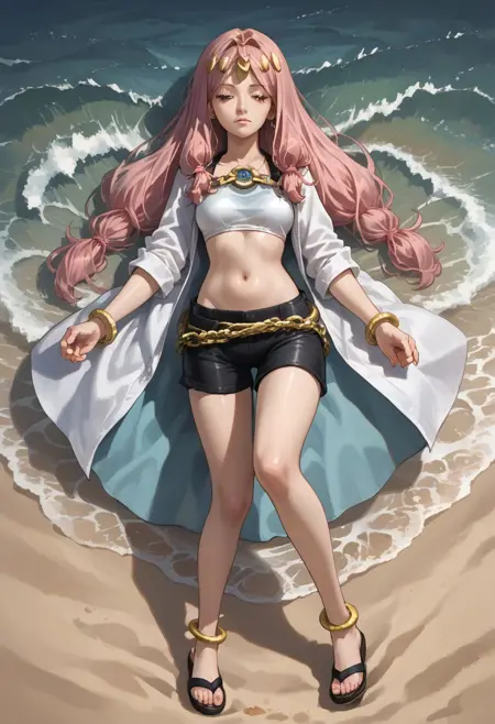 diadem, hourglass torso, see-thru torso, glass torso, pointed hood, long hood, pink hair, long hair, bracelet, anklet, pendant, closed eyes, bodysuit, hair ornaments, low front twintails