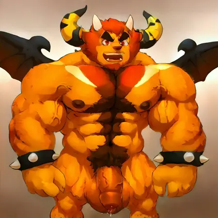 触发词:huoshen、恶魔翅膀、红发、带刺手环、角、红眼、肚脐、胸肌、毛茸茸的