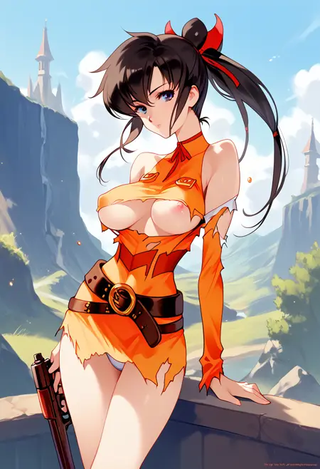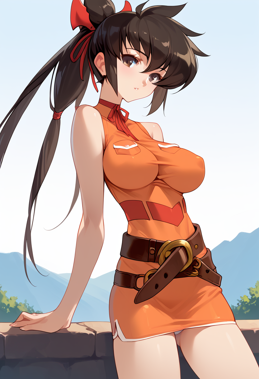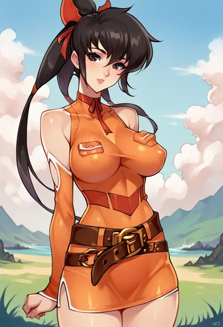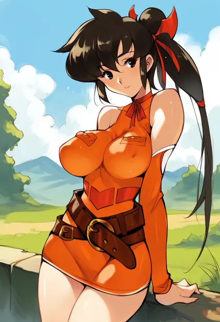 Trigger: lisapacifist, black hair female, ponytail, large breasts, bare shoulders, belt, mini dress, no bra
