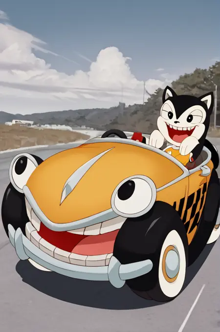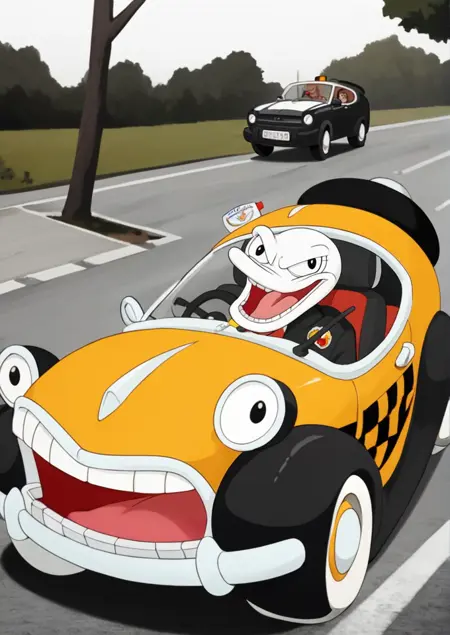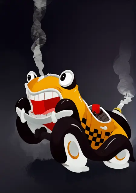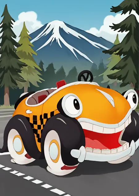 프롬프트: 베니, 만화 자동차, 만화 택시, 큰 눈, 헤드라이트 눈, 그릴 입, 기쁜 표정, 노란 택시, 핸들, 체크 무늬, 흰색 타이어, 평평한 타이어