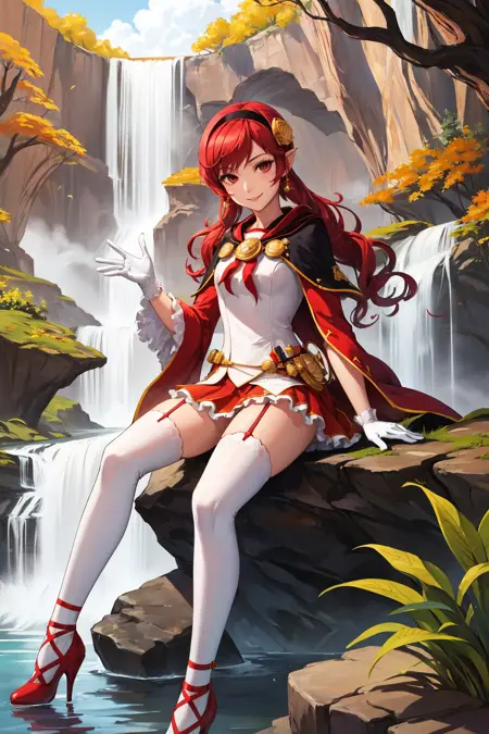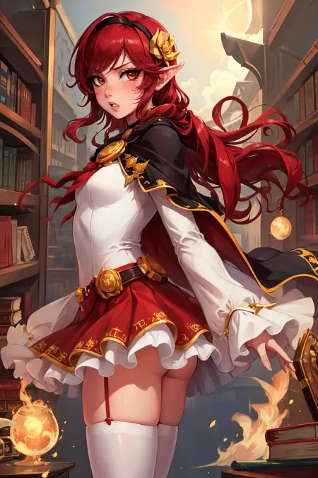 彼女の典型的な外見には、「ヘアバンド、黒いカペレット、白い手袋、白いシャツ、赤いスカート、白いタイツ、ガーターストラップ、ハイヒール」を追加してください。