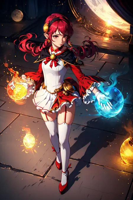 要获得她的典型外观,请添加 "发带、黑色短披风、白色手套、白色衬衫、红色短裙、白色过膝袜、吊袜带、高跟鞋"。